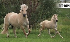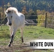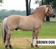 Fjord horses can be seen in five shades of dun. Ninety percent of them are brown dun, with golden body, black dorsal stripes and an oatmeal coloured muzzle. The other shades of dun include red dun, white dun, grey dun and the rarely seen yellow dun, whose stripe is darker yellow rather than black.